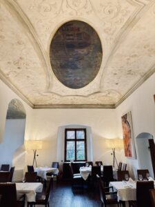 Art is part of the experience. When you enter, you might notice a work by Daniel Spoerri, known for his “Eat Art” concept. There is a table mounted on the wall that looks as if someone finished dinner and walked away. Glasses, plates and cutlery are frozen in time. It is modern, playful and surprising inside a building that is almost 900 years old.