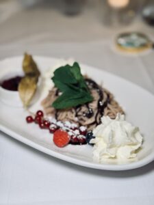 For dessert, I ordered Pfarrwirt’s Maronireis. It was light, creamy and not too sweet. The chocolate sauce and fresh berries made it even better. It is the kind of dessert that fits perfectly in autumn and leaves you satisfied without feeling heavy.